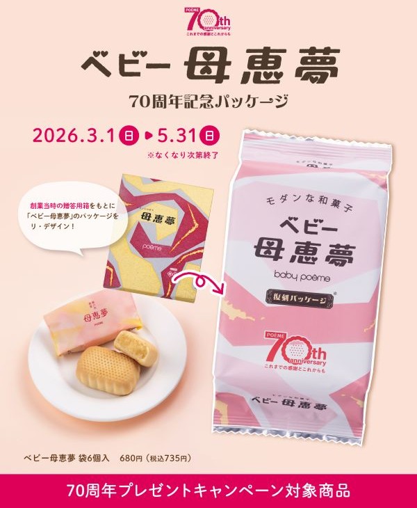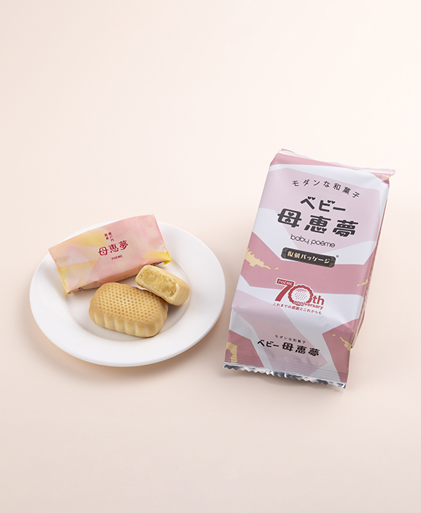 株式会社母恵夢創業70周年を記念して、創業当時の贈答用箱をもとに「ベビー母恵夢」のパッケージをリ・デザインしました。 デザインやロゴを引き継ぎつつ、「ベビー母恵夢」らしいやさしい色合いに仕上げました。 懐かしさを感じてくださる方にも、初めての方にも。 手に取った瞬間に「これまでの感謝とこれからも」の気持ちが届くように。 そんな思いを込めてつくったパッケージです。