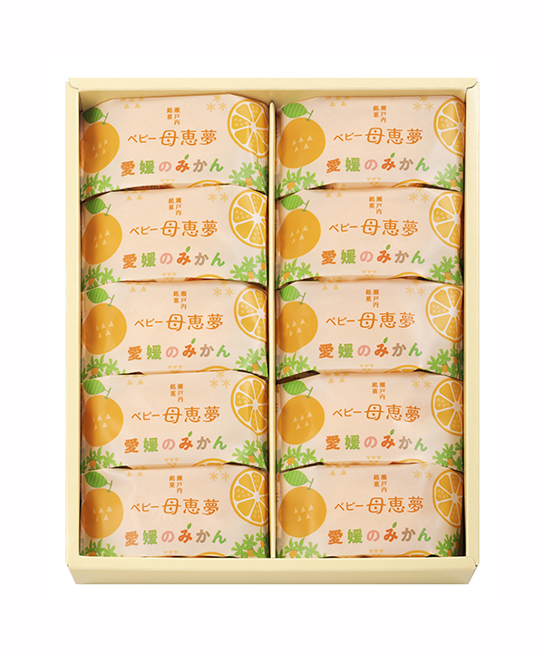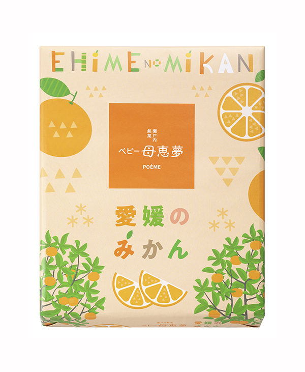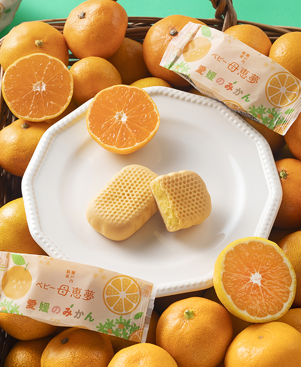 温暖な風土に育まれた温州みかんとベビー母恵夢がひとつになった、さわやかな風味が広がる、愛媛ならではのお菓子をお楽しみください。-