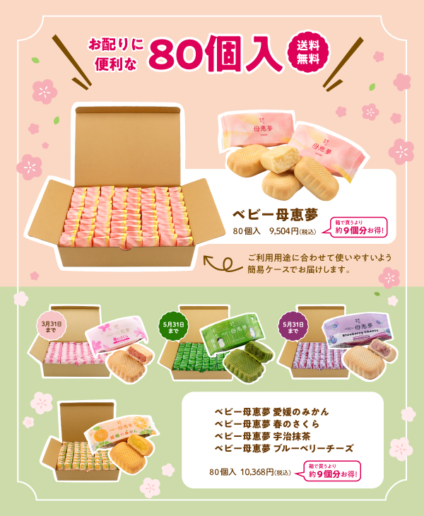 通常よりお得な価格でお買い求めいただける「ベビー母恵夢80個入」を販売中!
