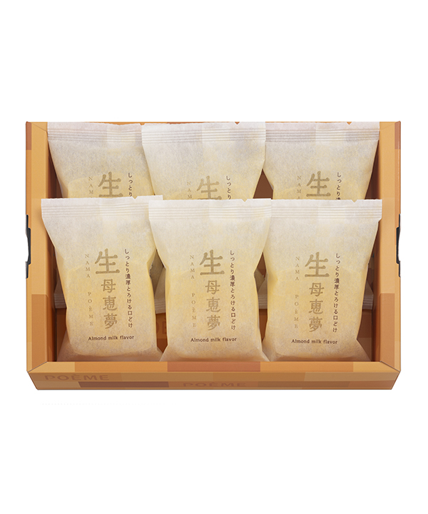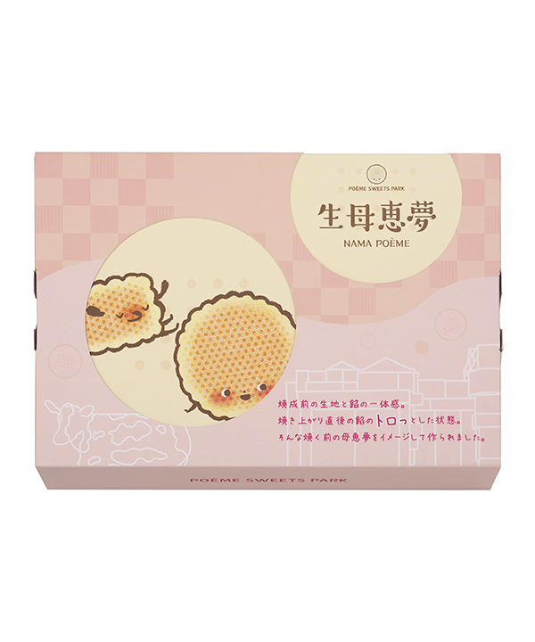 生地と餡が一体となった、なめらかな口どけの「生母恵夢」鳴門金時芋をベースにバターをたっぷり使った生地でアーモンドミルクを加えたしっとりとした黄味餡を包みました。スイーツパークでも大人気の「生母恵夢」をぜひご堪能ください。