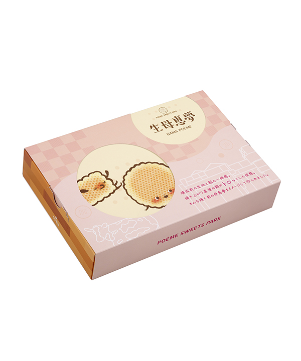 パッケージの窓からポエミーちゃんたちが覗いています。 スイーツパークのイラストや木目があしらわれていたりと、 店舗のイメージを全面に出した可愛らしいデザインです。箱の底にも…?!