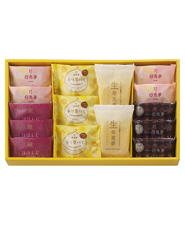 15個入(ベビー母恵夢:4個、ベビー母恵夢 冬のショコラ:3個、生母恵夢:2個、母恵夢のほほえむ:3個、手づ栗パイ:3個)