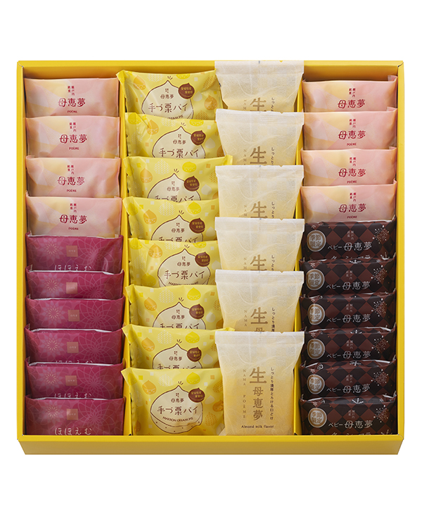 34個入(ベビー母恵夢:8個、ベビー母恵夢 冬のショコラ:6個、生母恵夢:6個、母恵夢のほほえむ:6個、手づ栗パイ:8個)