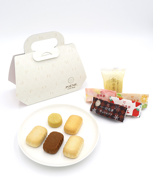 「ベビー母恵夢」「ベビー母恵夢愛媛のみかん」「生母恵夢」「ベビー母恵夢あまおう苺」「ベビー母恵夢冬のショコラ」が2個ずつ、計10個入っています。
