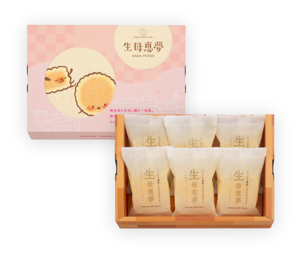 スイーツパークで一番人気の生母恵夢!パッケージの窓からポエミーちゃんたちが覗いています。スイーツパークのイラストや木目があしらわれていたりと、店舗のイメージを全面に出した可愛らしいデザインです。箱の底にも…?!