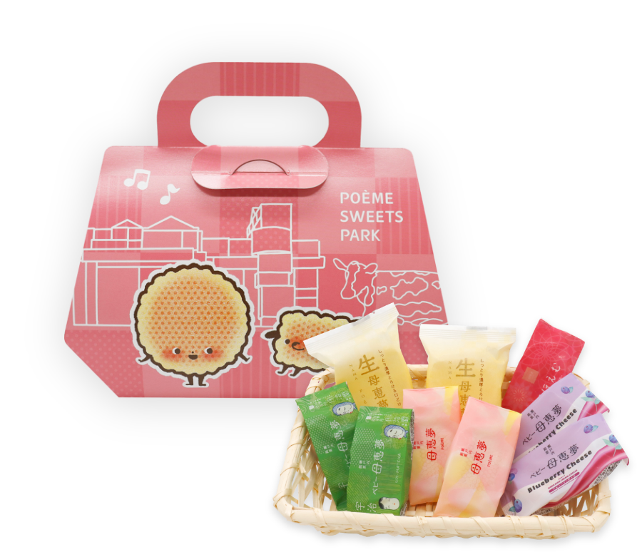 POEME Gift Bagは計10個入りの愛媛の名産品「みかん」をイメージした限定バッグ。スイーツパークオリジナルバッグは計9個入りのスイーツパークを連想させる可愛らしいデザインの限定バッグです。